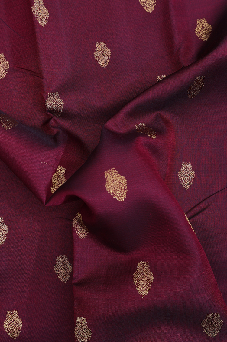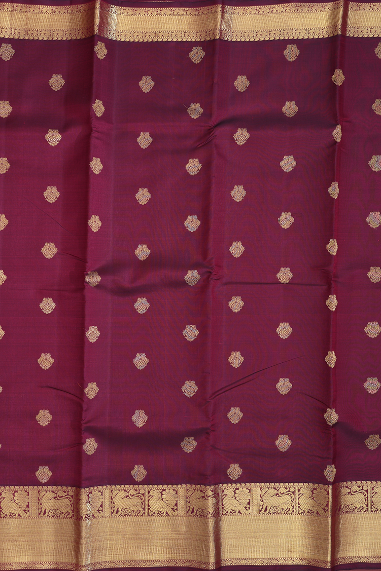 Kanchipuram Silk Saree In Dark Maroon With Parrot Buttas