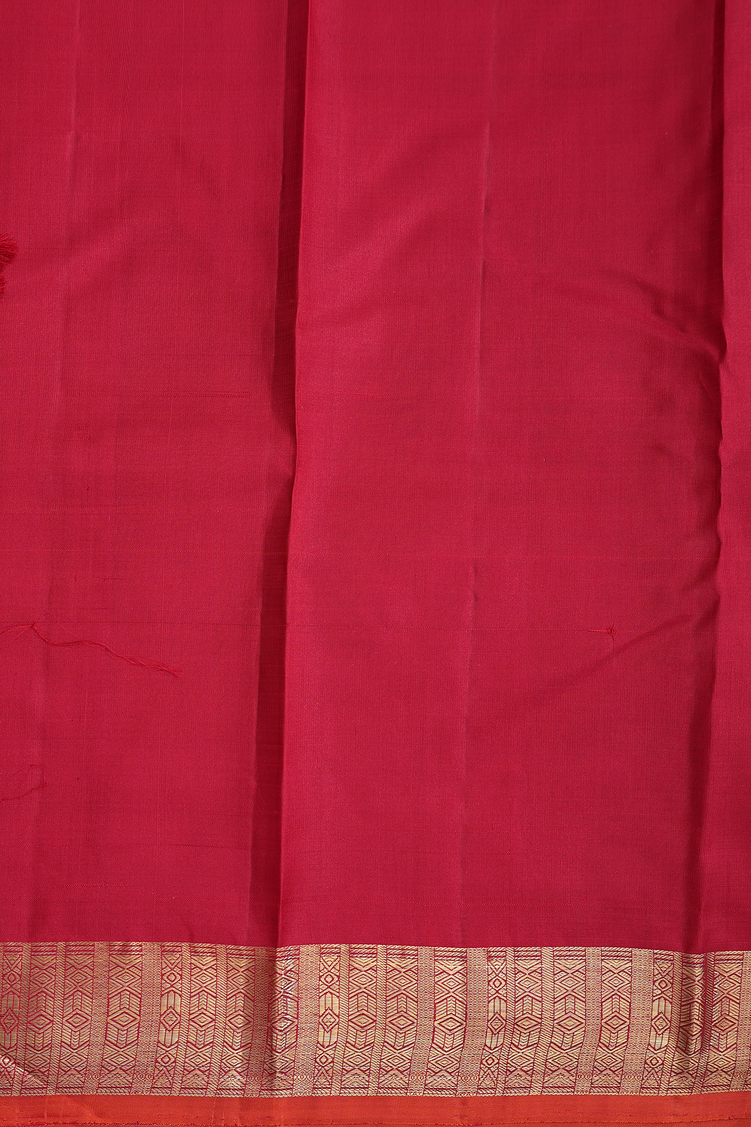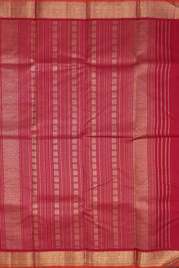 Experience timeless elegance with this Kanchipuram silk saree in a rich red hue, adorned with delicate zari buttas and zari border completed by orange selvedge that shimmer gracefully. Crafted from premium silk, it offers a luxurious texture and vibrant finish, perfect for celebrations and special occasions. The intricate zari detailing enhances its sophisticated charm, making it a statement piece in any wardrobe. Embrace tradition with a contemporary touch in this exquisite saree.