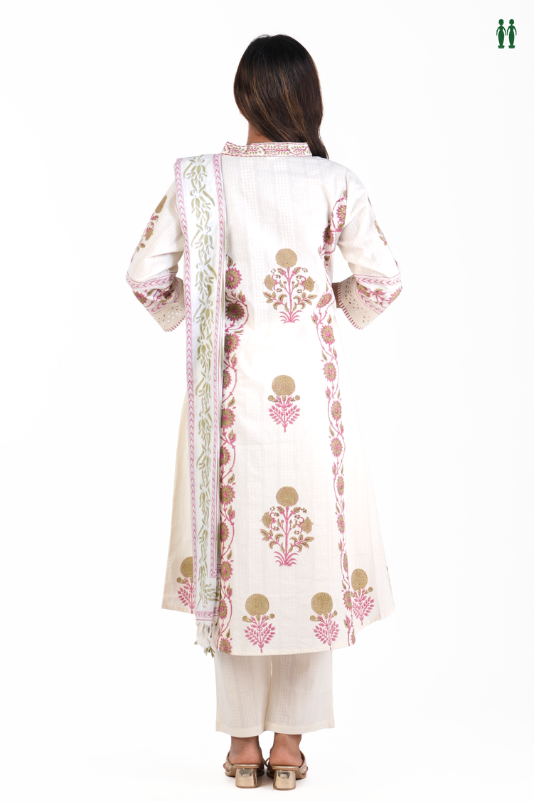 Embrace timeless elegance with this v-neck floral printed white cotton salwar set. Crafted from breathable cotton, it offers comfort throughout the day, while the delicate floral print adds a subtle charm. The flattering v-neck design enhances sophistication, making it perfect for both casual and semi-formal occasions. A graceful blend of style and ease that elevates your wardrobe effortlessly.