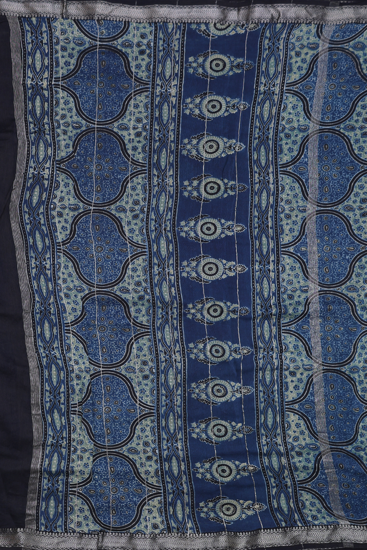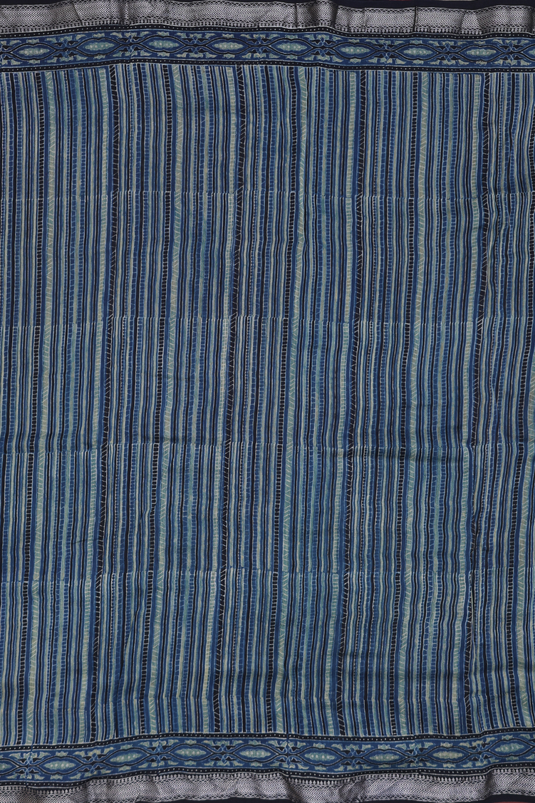 Ajrakh Cotton Saree In Capri Blue With Stripes Design