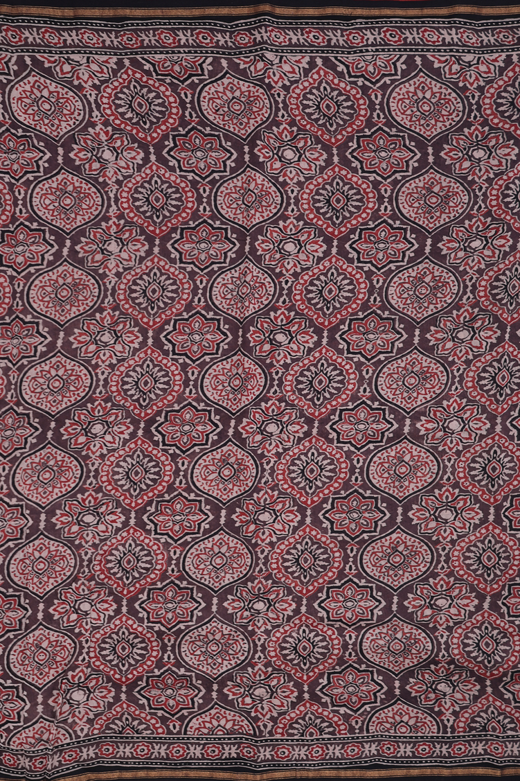 Ajrakh Cotton Saree In Coffee Brown With Floral Design