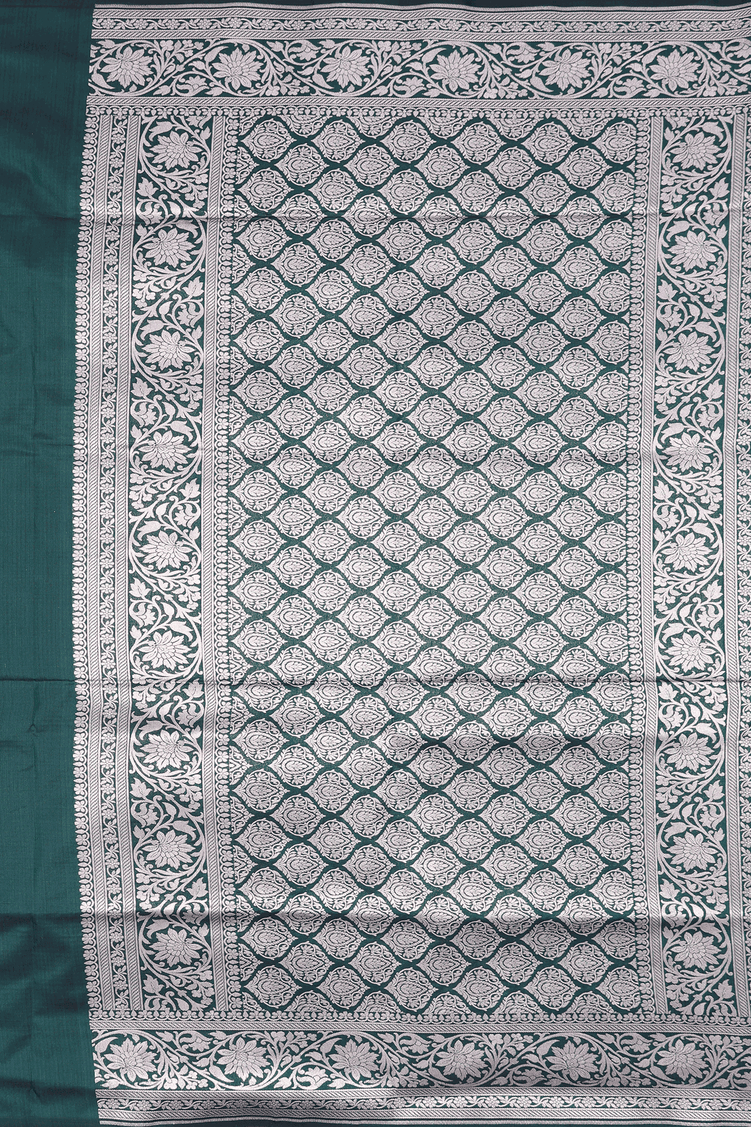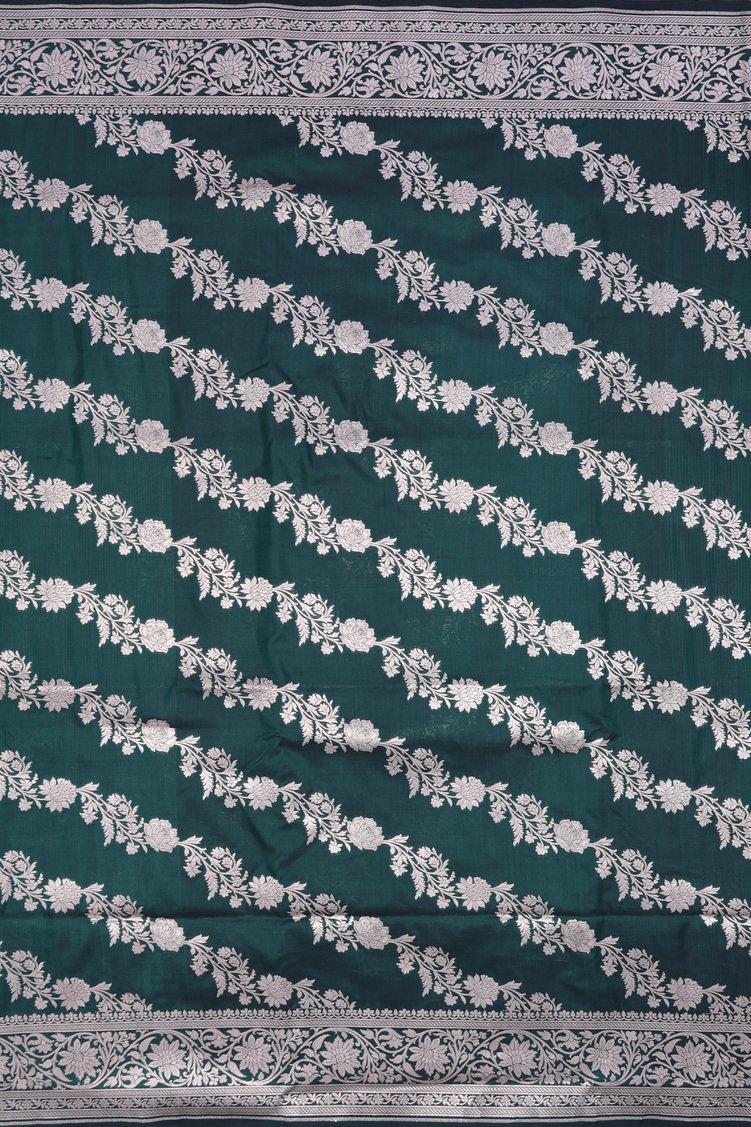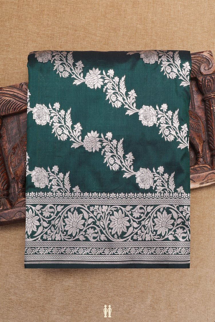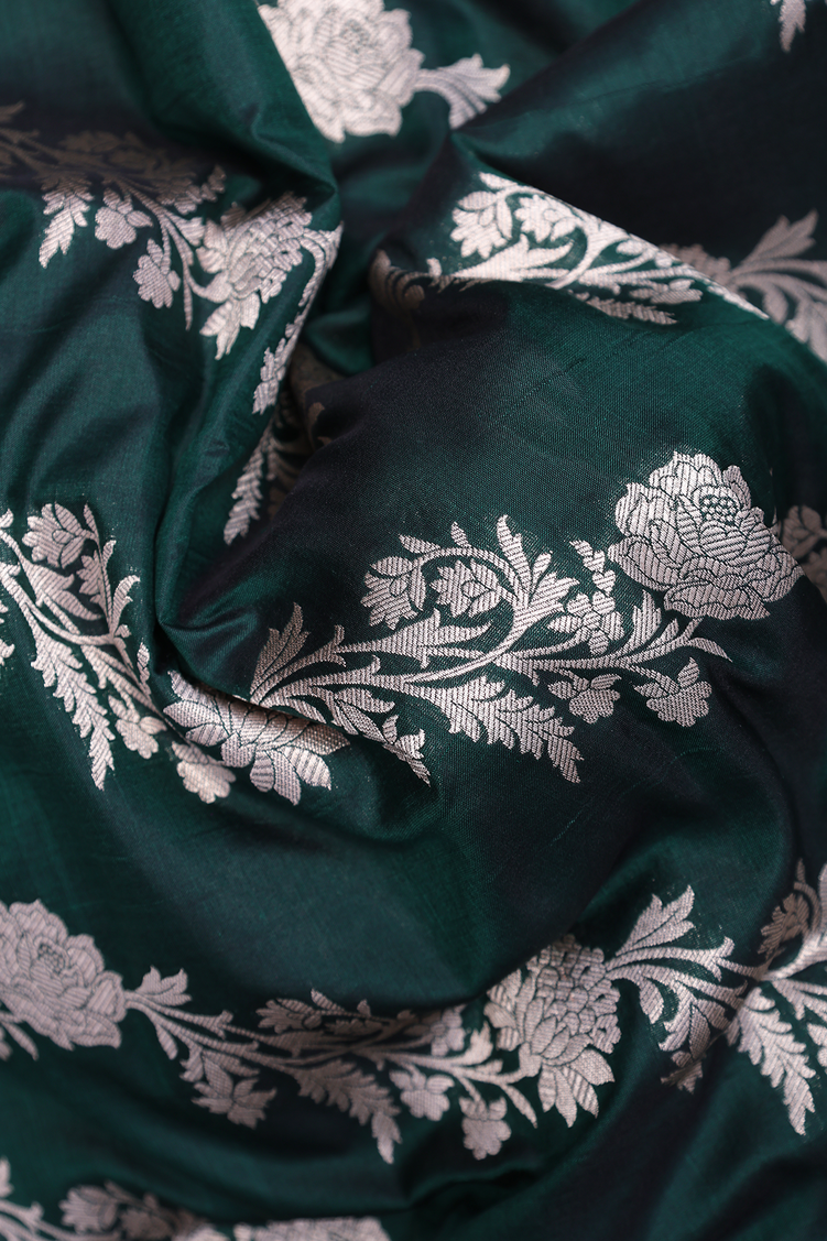 Exquisite banarasi silk saree in a rich dark green hue, adorned with intricate floral motifs woven in traditional techniques. This timeless masterpiece showcases the renowned craftsmanship of varanasi, offering an elegant silhouette and luxurious drape perfect for special occasions and cultural celebrations.