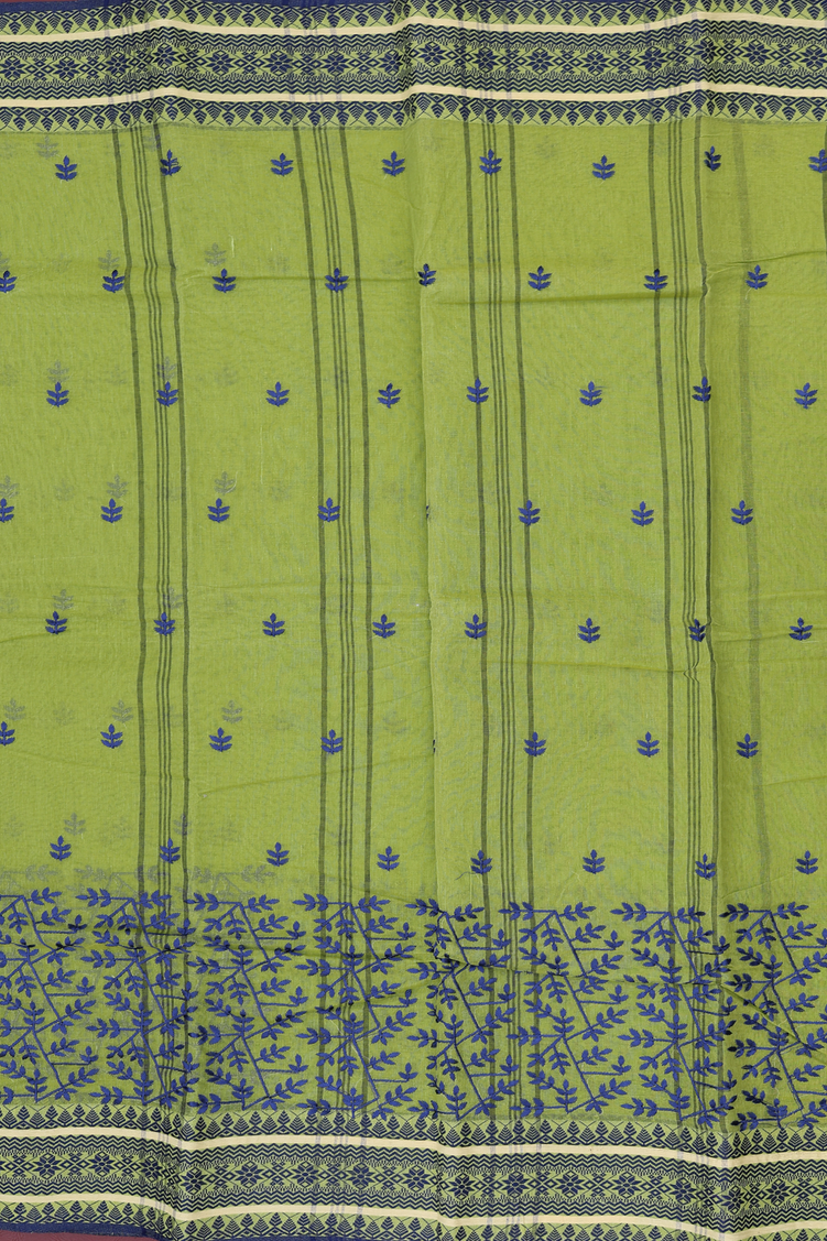 Embrace timeless elegance with this bengal cotton saree in a serene moss green hue. Adorned with delicate leaf buttas scattered throughout, this piece celebrates traditional craftsmanship with understated sophistication. The breathable cotton fabric ensures comfort for all-day wear, while the intricate botanical motifs add visual depth and character. Perfect for both casual gatherings and refined occasions, this saree effortlessly transitions from day to evening. A versatile wardrobe essential that honors heritage while maintaining contemporary appeal.