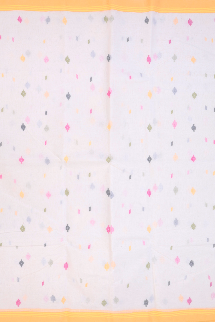 This elegant bengal cotton saree in pristine white features delicate threadwork buttas, combining traditional craft with subtle charm. Its breathable fabric ensures comfort, while the refined embroidery adds a touch of sophistication, making it perfect for both casual and formal occasions.