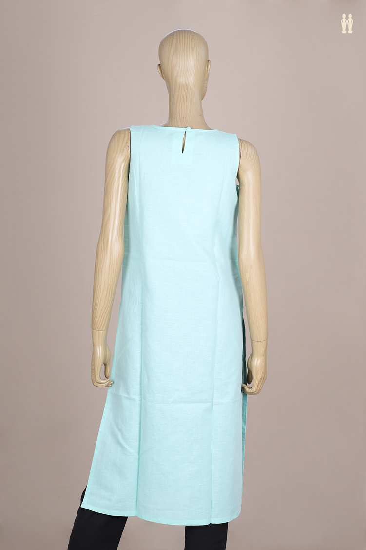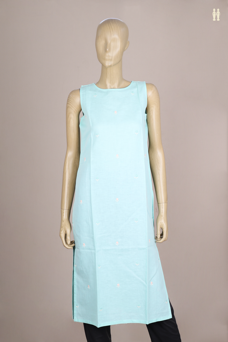 Boat Neck Floral Buttas Mint Blue Linen Long Kurta