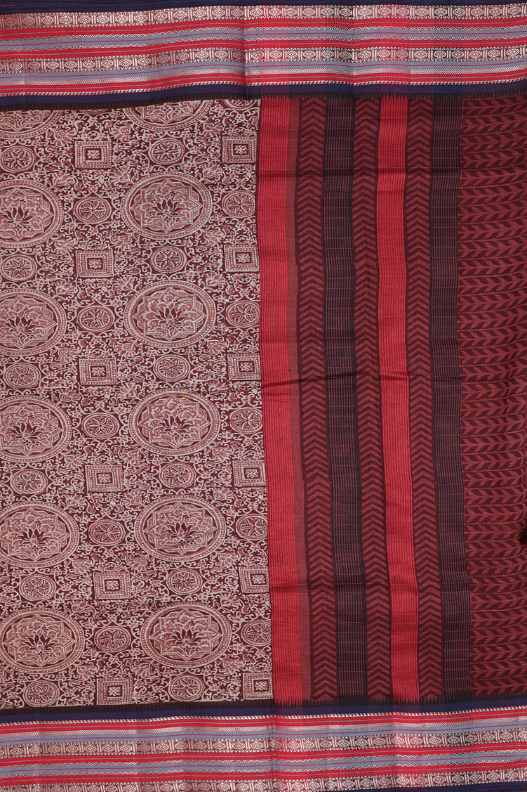 Experience timeless elegance with this chanderi cotton saree in a rich brown hue, featuring intricate printed designs. Lightweight and breathable, it offers comfort throughout the day paired with a refined look suitable for both casual and formal occasions. This saree beautifully blends traditional craftsmanship with subtle sophistication, making it a perfect addition to your wardrobe.