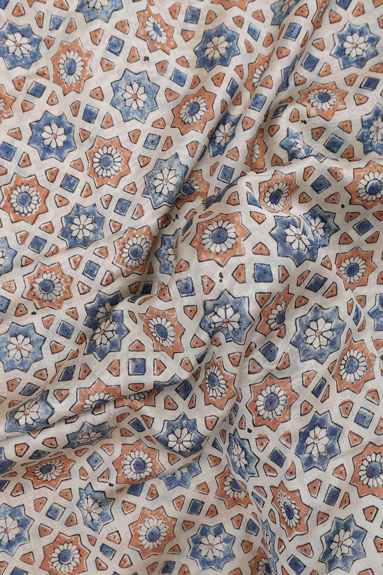 Elevate your elegance with this chanderi silk cotton saree in a subtle beige hue, adorned with intricate ajrakh printed motifs. The blend of silk and cotton offers a graceful drape and comfortable wear, perfect for both formal occasions and festive celebrations. Its timeless design reflects artisanal craftsmanship, making it a refined addition to your wardrobe.
