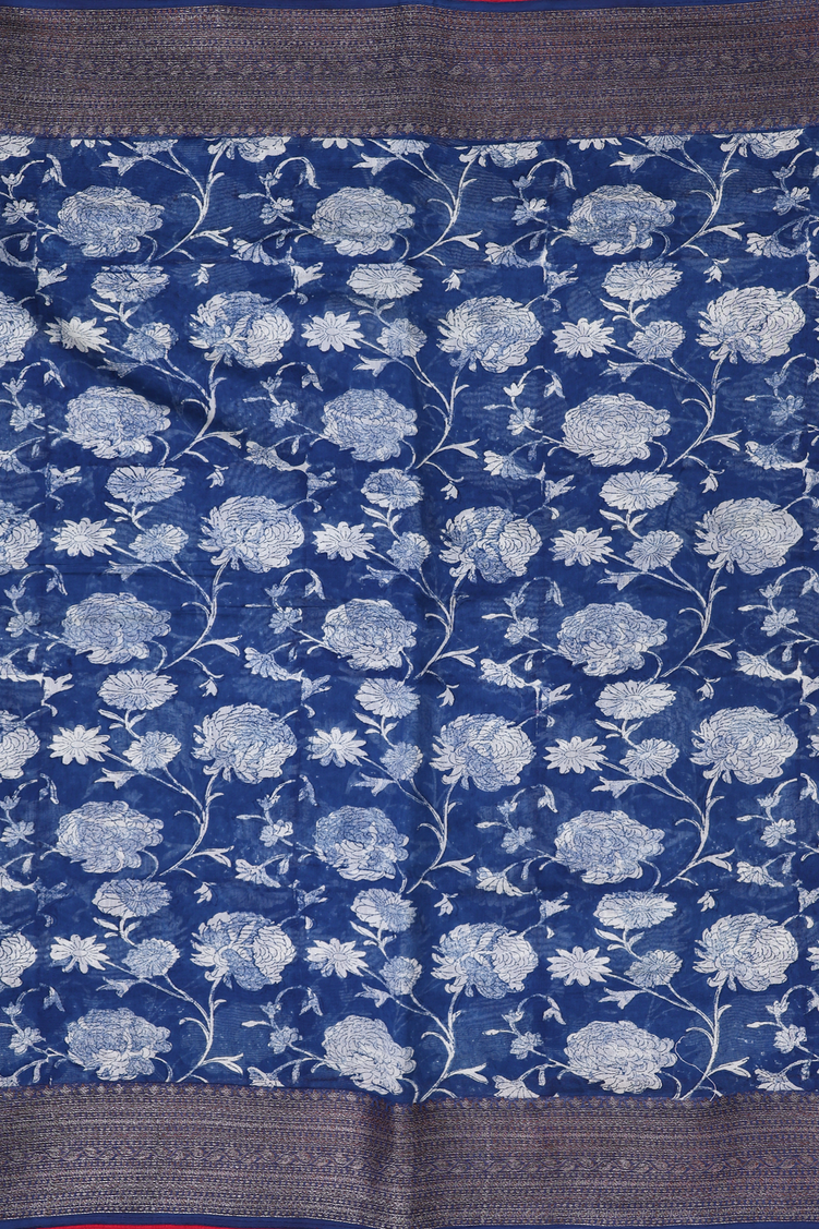 Chanderi Silk Cotton Saree In Prussian Blue With Floral Design