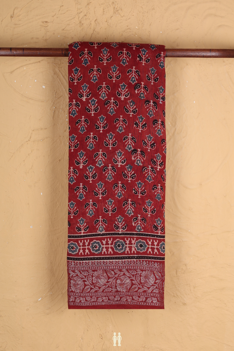 Chanderi Silk Cotton Saree In Rust Red With Floral Design