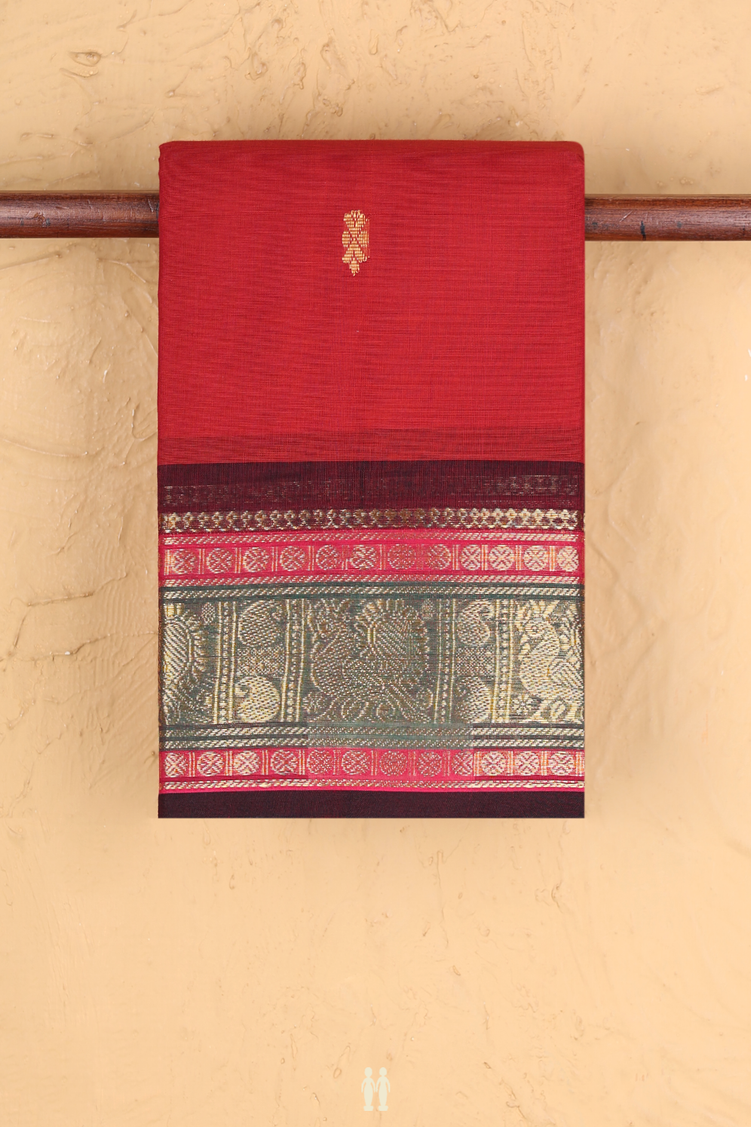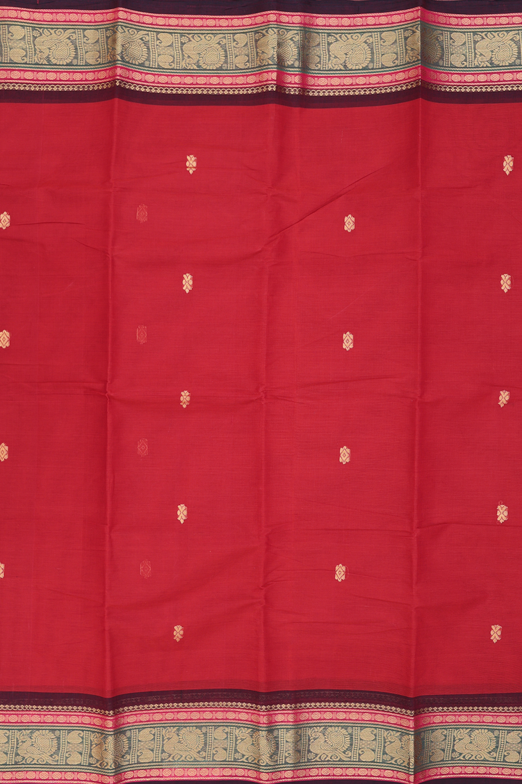 Chettinadu Cotton Saree In Brick Red With Threadwork Buttas