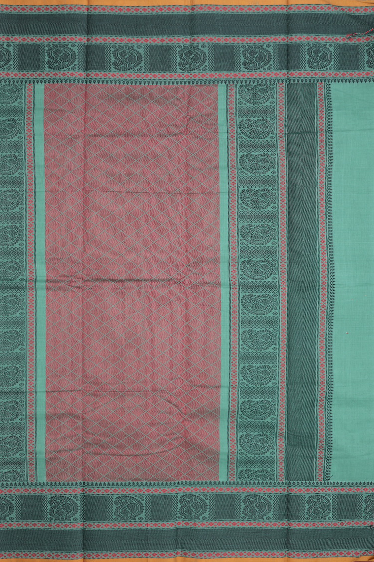 Experience the timeless elegance of this chettinadu cotton saree in a refined dusty green shade, adorned with intricate paisley buttas and threadwork border completd by orange selvedge. Crafted from breathable cotton, it offers comfort without compromising on style, making it perfect for both casual and formal occasions. The delicate motifs add a subtle charm, reflecting traditional artistry with a contemporary touch. Elevate your wardrobe with this graceful blend of tradition and sophistication.