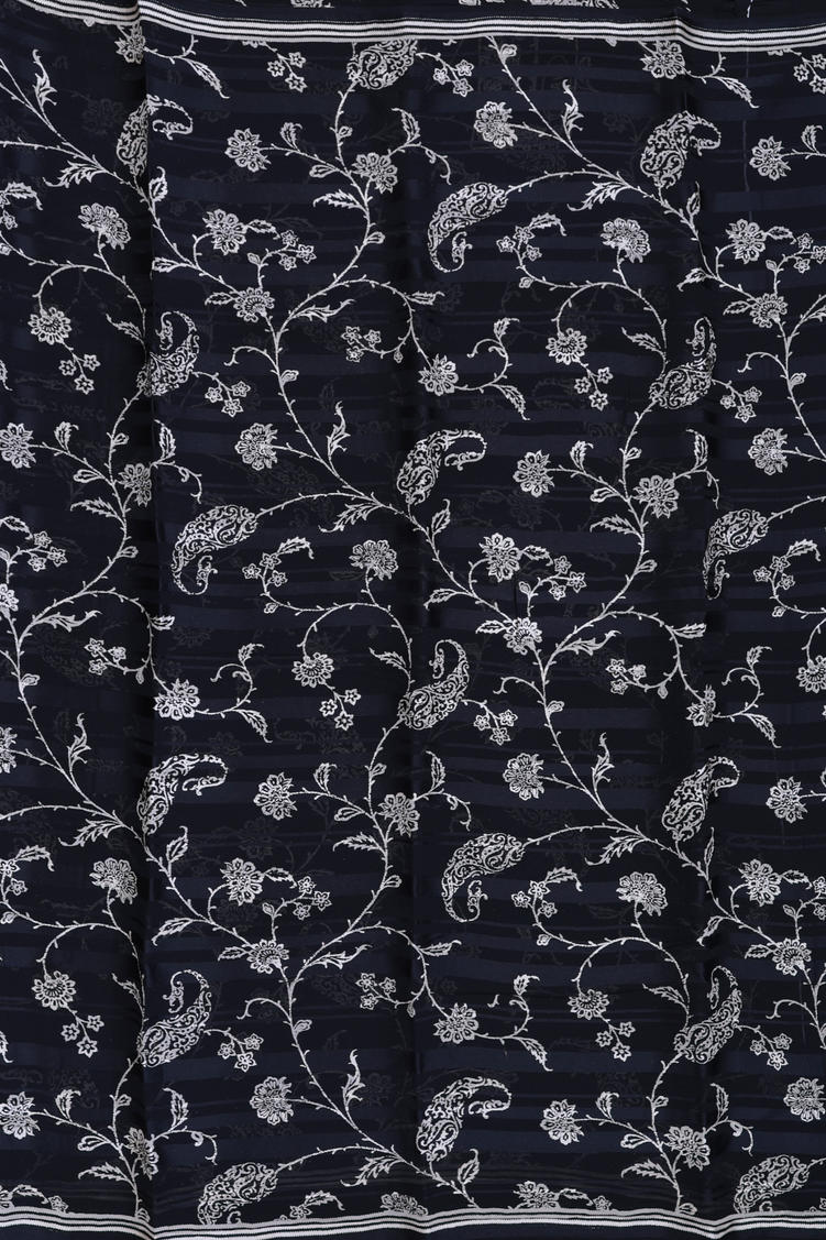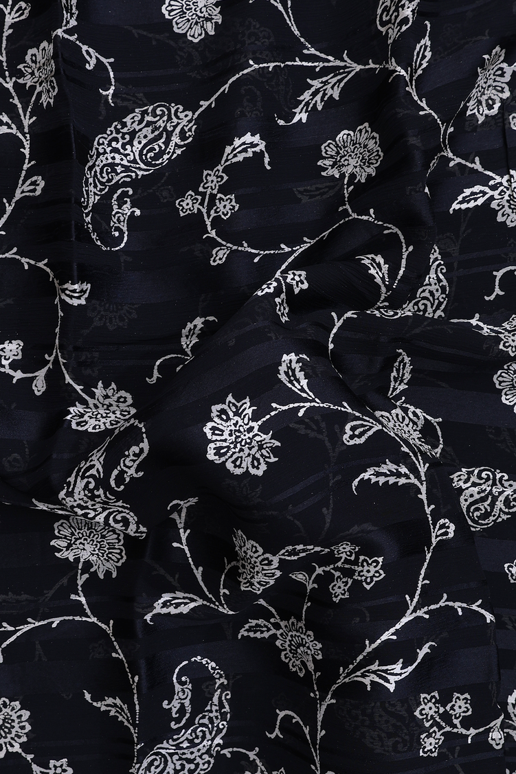 This elegant black chiffon saree features a delicate floral print that gracefully enhances its lightweight, flowing fabric. Perfect for sophisticated occasions, it drapes beautifully to provide both comfort and style. The subtle floral design adds a timeless charm, making it a versatile addition to your wardrobe.