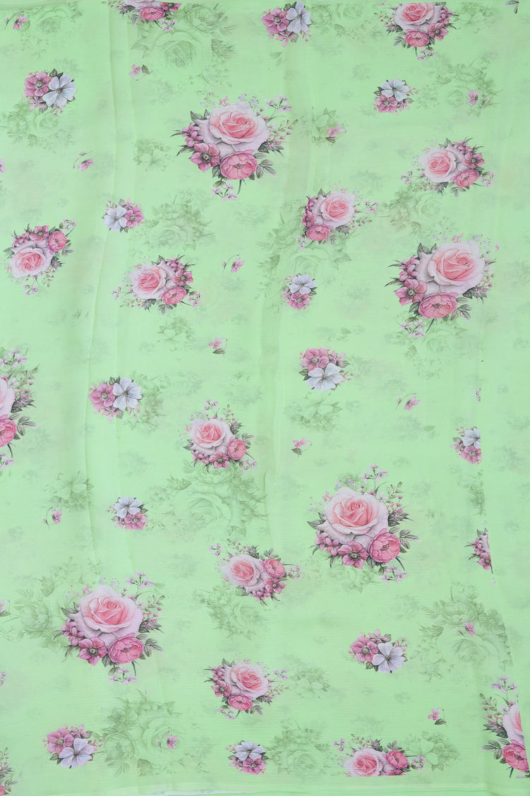 Elevate your elegance with this green chiffon saree, adorned with delicate floral prints that bring a timeless charm. Its lightweight fabric drapes gracefully, ensuring comfort and a refined silhouette. Perfect for celebrations or formal occasions, this saree combines classic beauty with effortless sophistication.