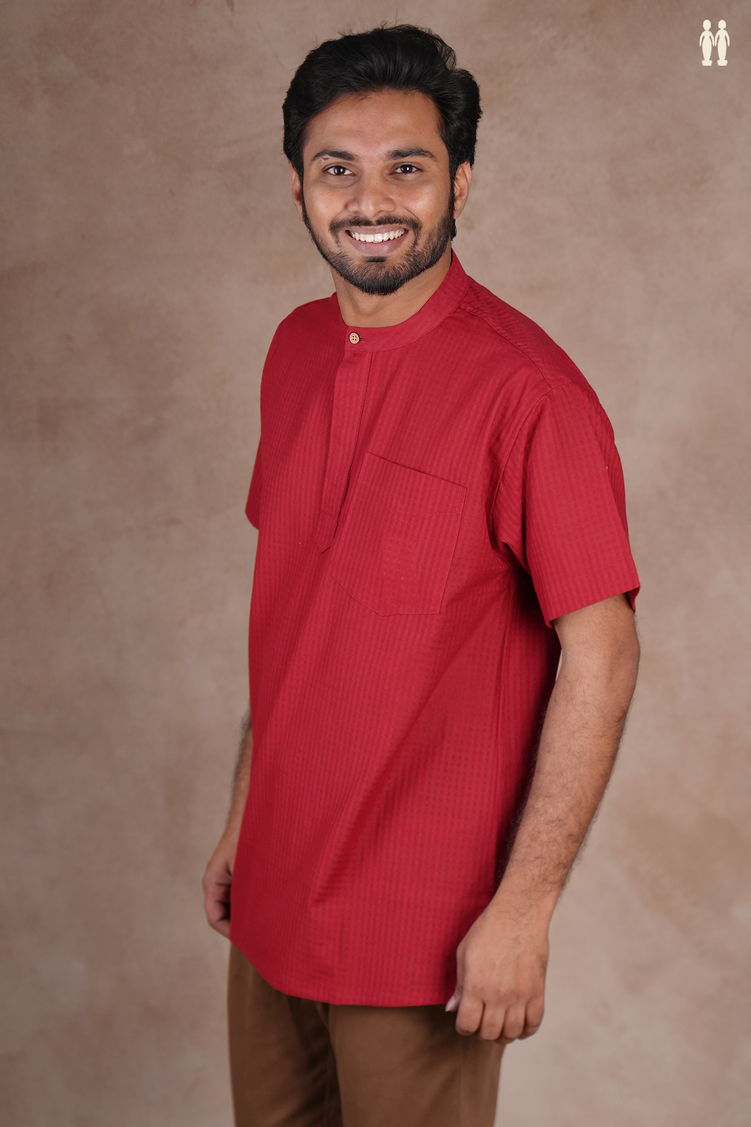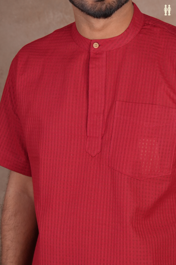 Elevate your everyday wardrobe with this refined red cotton kurta, featuring a distinctive Chinese collar and subtle checks design. Crafted from breathable cotton, this short-length silhouette offers effortless comfort and contemporary style. The structured collar adds a polished touch, making it versatile enough for casual outings or relaxed gatherings. Perfect for those seeking understated elegance with modern sensibility.