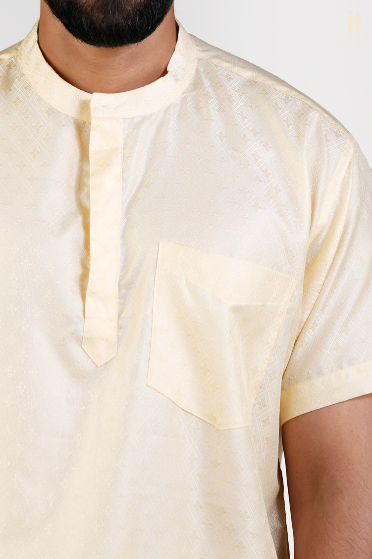 This pale yellow banarasi short kurta features an elegant chinese collar and intricate diamond patterns, offering a refined blend of traditional craftsmanship and contemporary style. Its lightweight fabric ensures comfort, making it perfect for both festive occasions and casual gatherings. Elevate your wardrobe with this sophisticated piece that effortlessly combines timeless heritage with modern design.