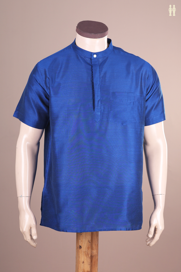Chinese Collar Plain Blue Semi Raw Silk Short Kurta