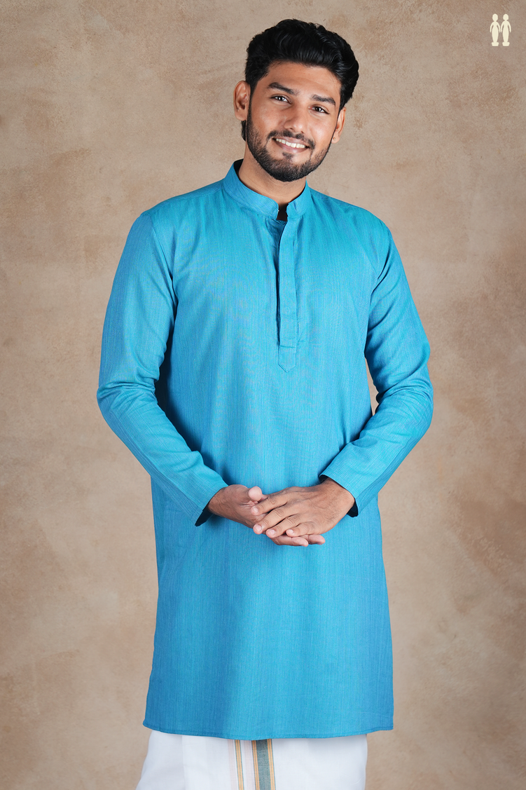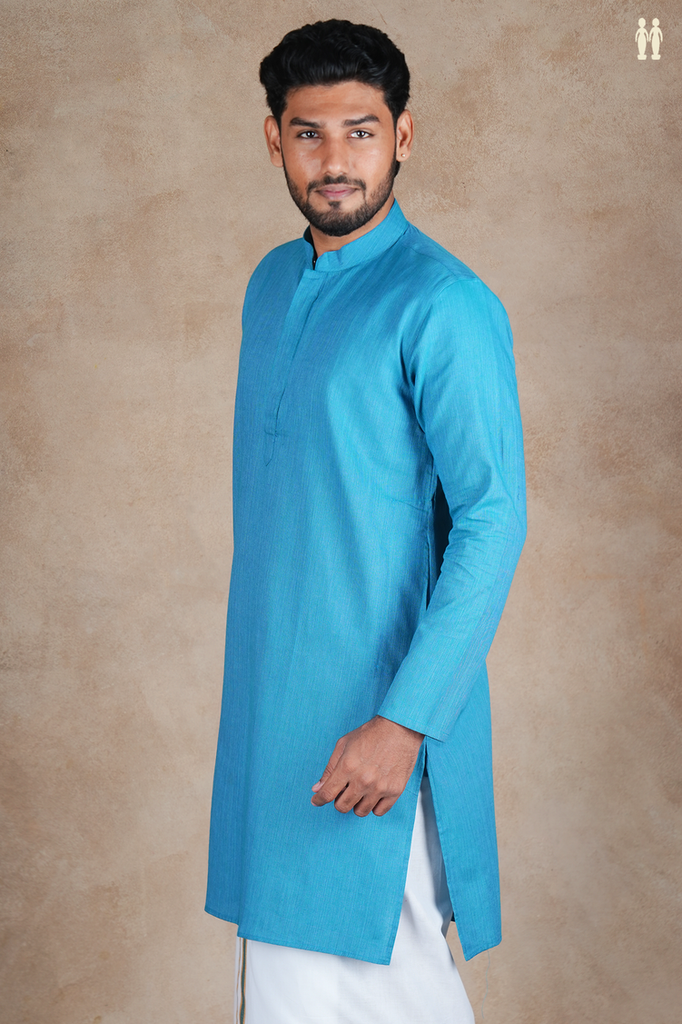 Elevate your everyday wardrobe with this refined cerulean blue cotton kurta, a timeless piece that seamlessly blends traditional elegance with contemporary style. Crafted from breathable cotton, this long kurta features a distinctive chinese collar that adds a modern edge to its classic silhouette. The serene blue hue complements all skin tones, making it versatile for both casual gatherings and semi-formal occasions. Perfect for layering or wearing solo, this sophisticated kurta promises comfort without compromising on style, offering you an effortless way to express understated grace.