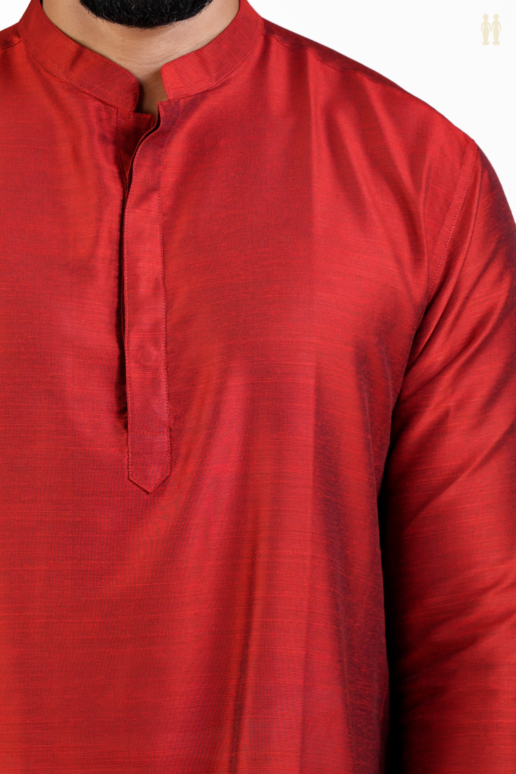 Chinese Collar Plain Red Semi Raw Silk Long Kurta