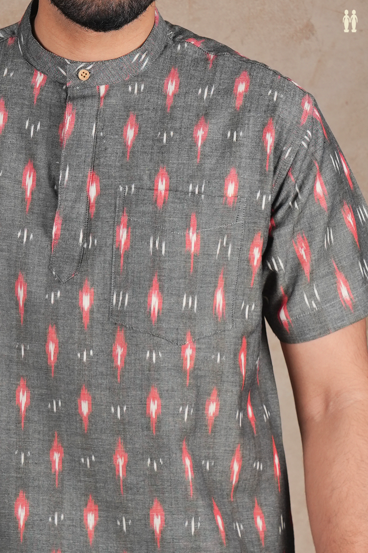 Chinese Collar Printed Design Grey Ikat Cotton Short Kurta