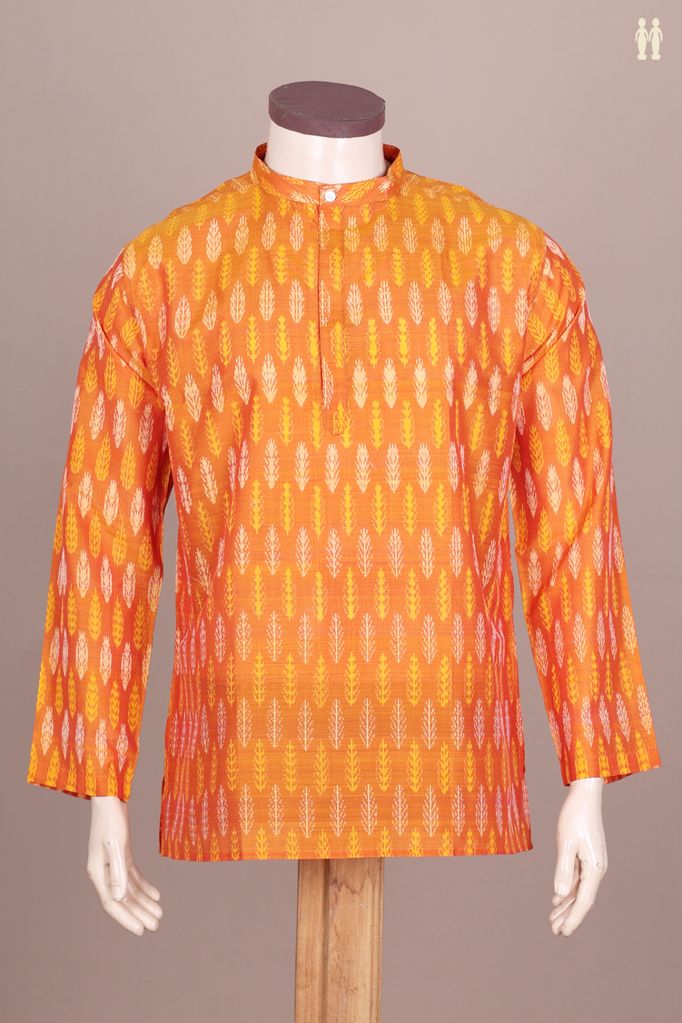 Chinese Collar Printed Design Orange Silk Cotton Short Kurta