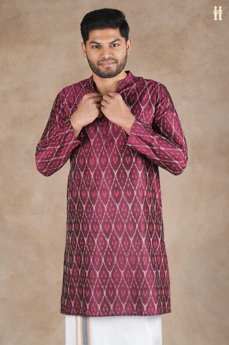 Chinese Collar Printed Design Berry Purple Ikat Cotton Long Kurta