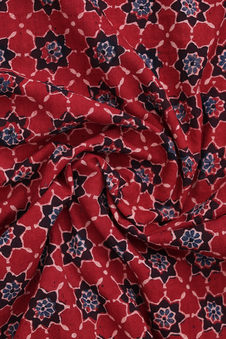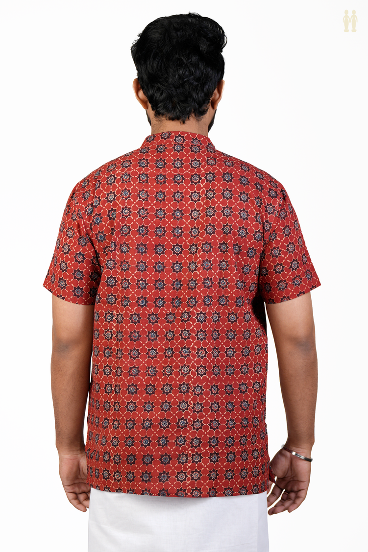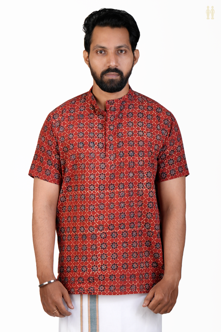 Chinese Collar Printed Design Red Ajrakh Cotton Short Kurta