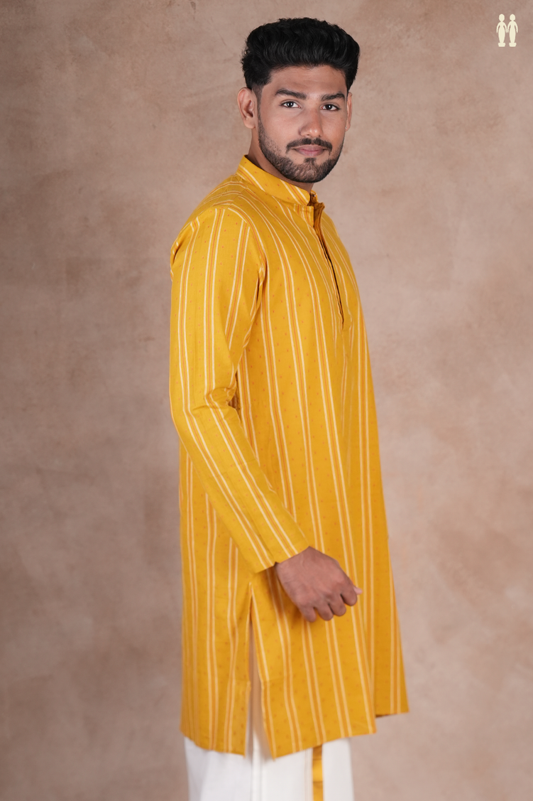 Elevate your everyday wardrobe with this refined long kurta, featuring a striking chinese collar and subtle stripe detailing in warm honey yellow. Crafted from breathable cotton, this piece seamlessly blends traditional silhouette with contemporary design elements, offering both comfort and understated elegance. Perfect for casual gatherings or relaxed office settings, it pairs effortlessly with traditional bottoms or modern trousers for versatile styling options.