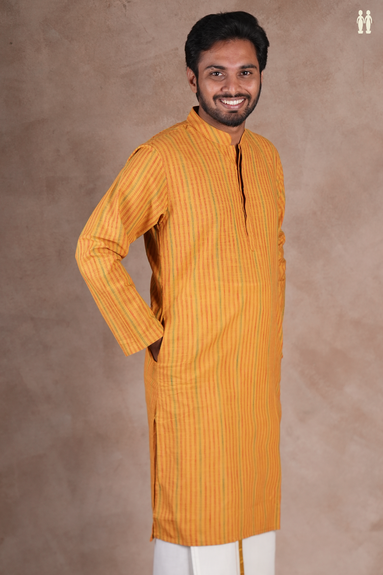 Elevate your everyday wardrobe with this refined long kurta, featuring a striking chinese collar and subtle stripe detailing. Crafted from breathable cotton in a warm mustard yellow hue, this piece seamlessly blends contemporary design with timeless elegance. The structured collar adds a modern edge, while the flowing silhouette ensures comfort throughout the day. Perfect for casual gatherings or layered styling, this kurta is a versatile essential for the discerning dresser.