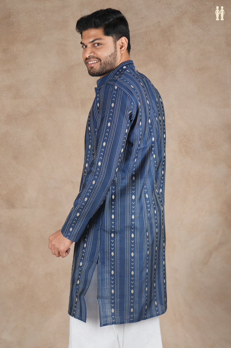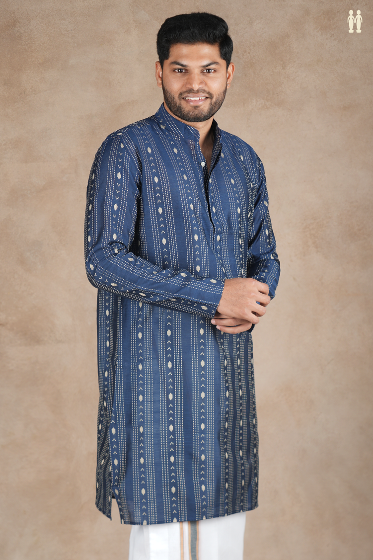 Chinese Collar Stripes Design Oxford Blue Raw Silk Long Kurta