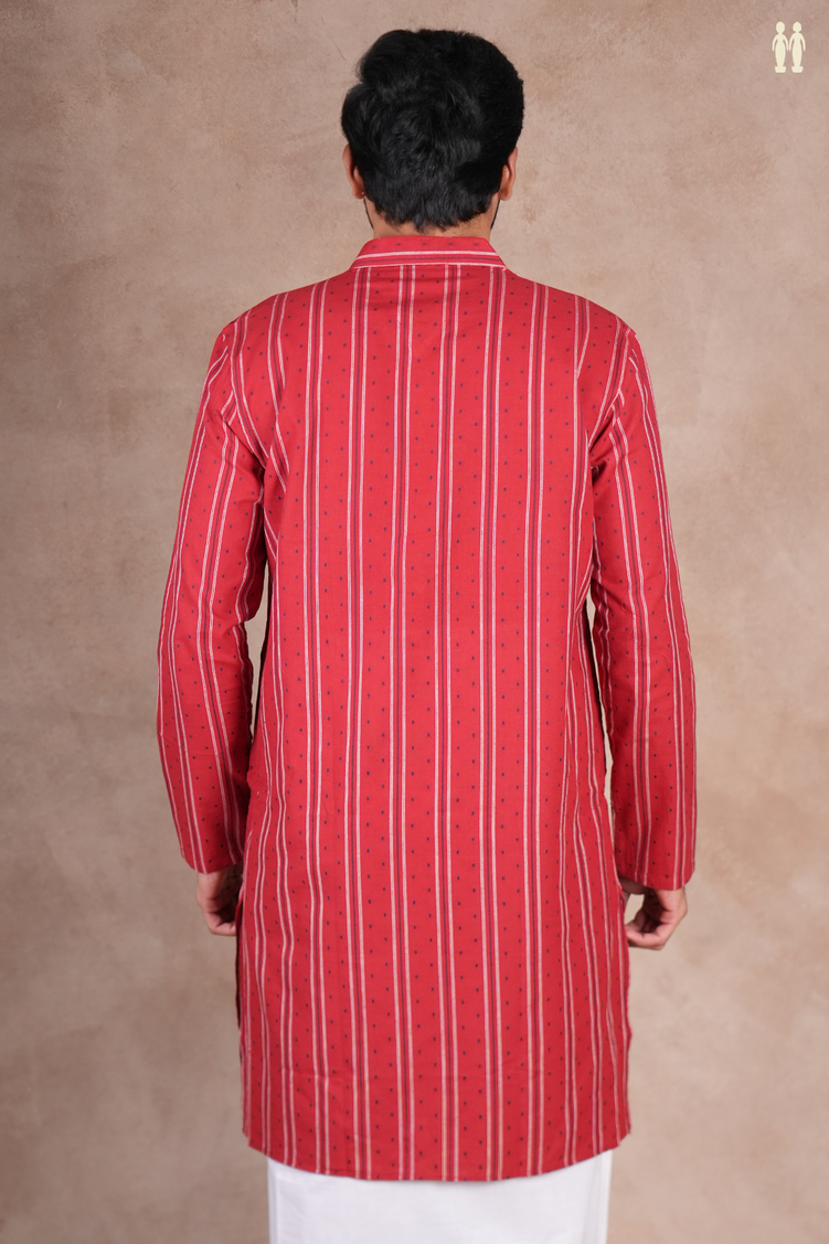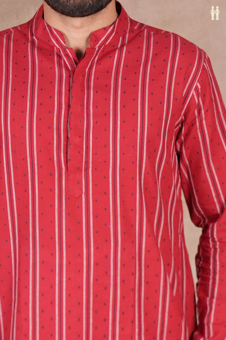 Chinese Collar Stripes Design Red Cotton Long Kurta