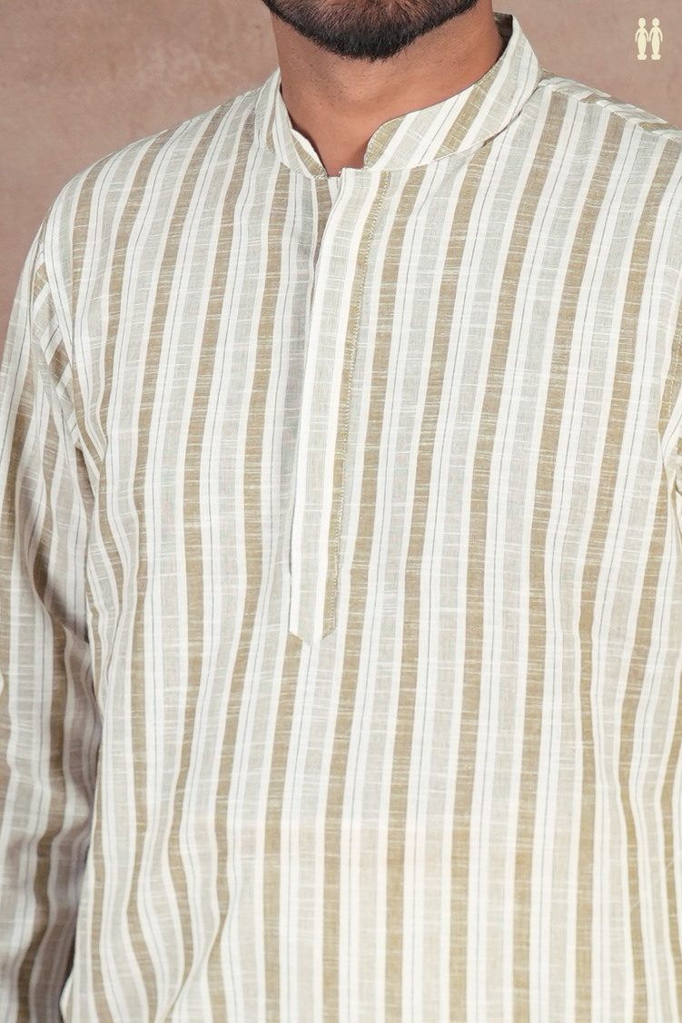 Chinese Collar Stripes Design White And Green Cotton Long Kurta
