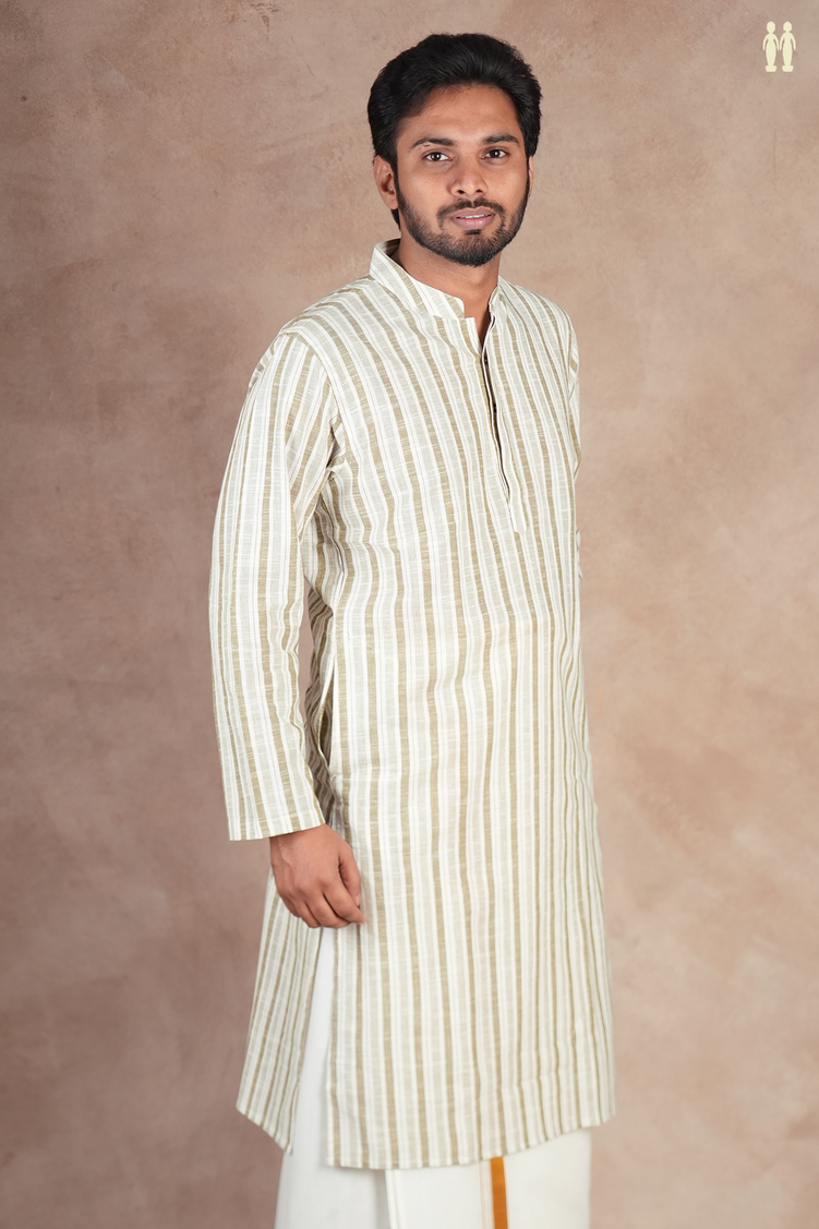 Elevate your everyday wardrobe with this refined cotton long kurta, featuring a distinctive Chinese collar and elegant white-and-green striped design. Crafted from breathable cotton, this piece seamlessly transitions from casual gatherings to semi-formal occasions. The structured collar adds a contemporary edge while maintaining traditional sensibilities, making it an ideal choice for the modern Indian wardrobe. Perfect for layering or wearing standalone, this kurta combines comfort with understated sophistication.