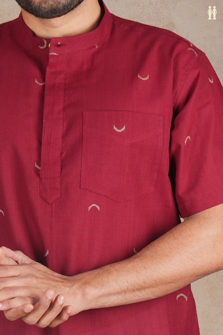Elevate your everyday wardrobe with this refined red cotton kurta, featuring an elegant Chinese collar that adds contemporary flair to a timeless silhouette. Intricate threadwork buttas adorns the fabric, creating subtle texture and visual depth that speaks to meticulous craftsmanship. The short length offers versatile styling—perfect for pairing with traditional bottoms or modern separates. Crafted from breathable cotton, this piece combines comfort with understated sophistication, making it an essential addition for those who appreciate quality and nuanced design.
