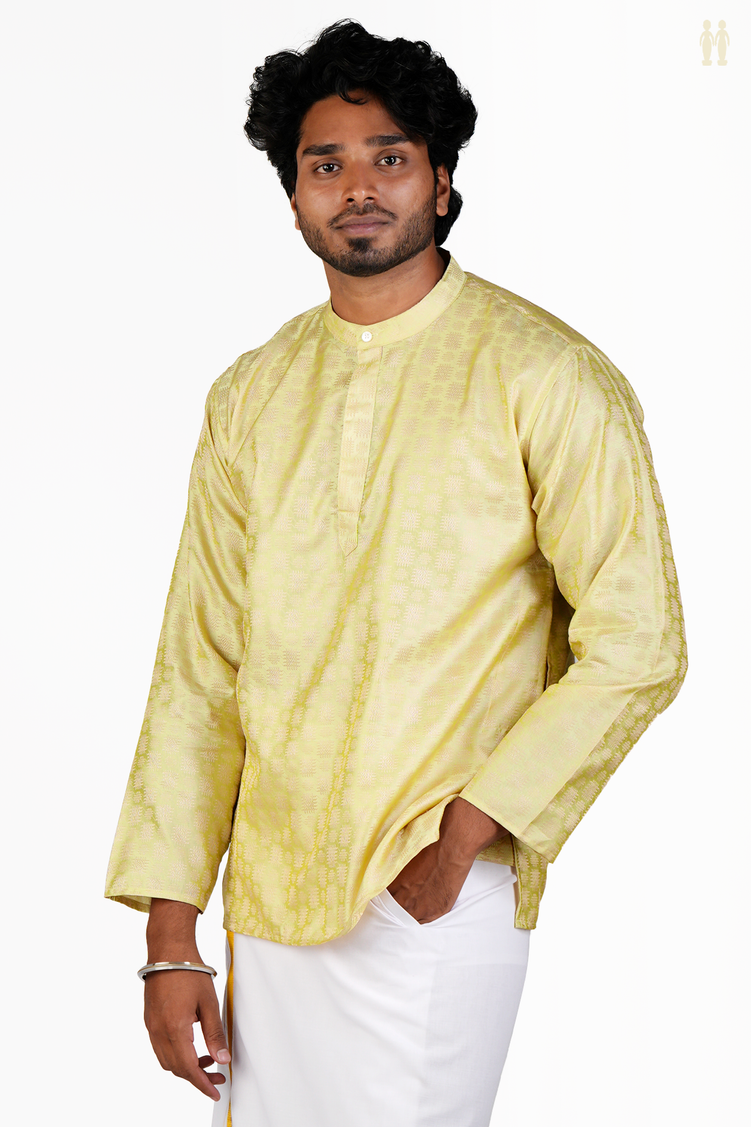 Chinese Collar Threadwork Design Green Beige Banarasi Short Kurta