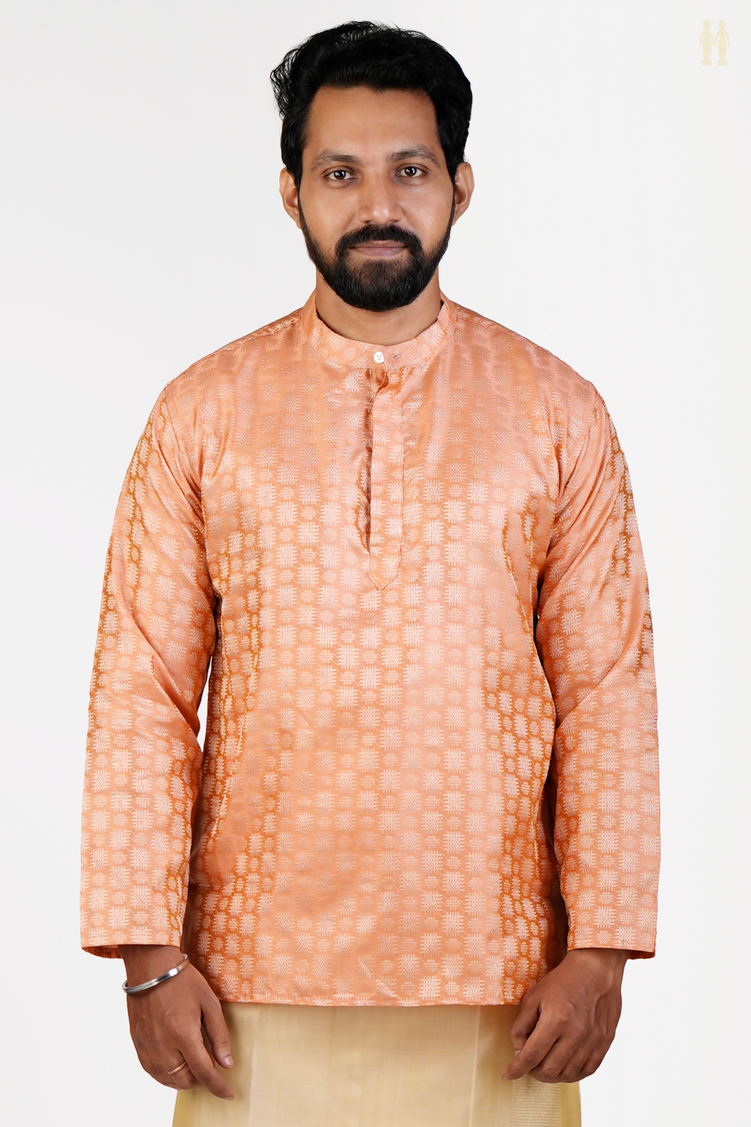 Elevate your ethnic wardrobe with this dusty orange banarasi short kurta, featuring a distinctive Chinese collar and intricate threadwork design. Crafted with Banarasi fabric, it blends traditional artistry with modern silhouette, offering both elegance and comfort. Perfect for festive occasions or stylish casual wear, this kurta adds a refined charm to your ensemble.