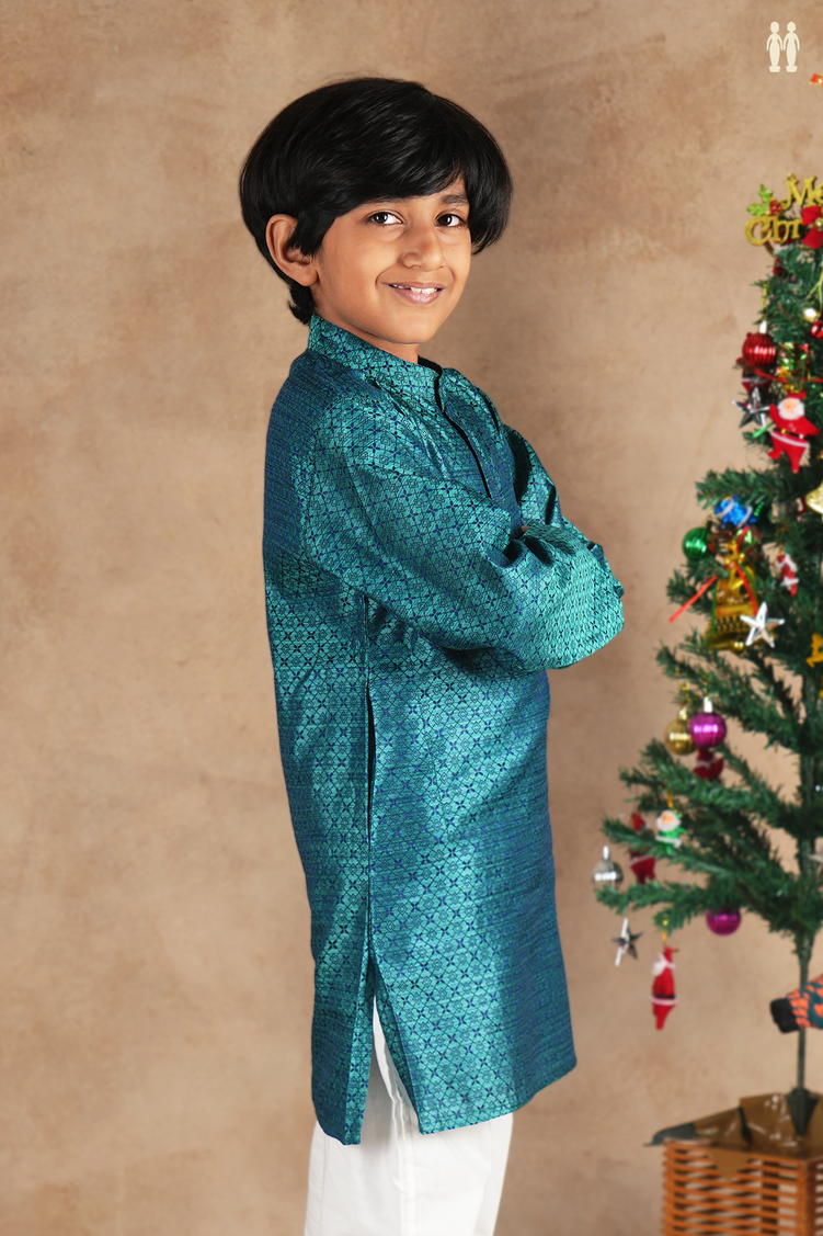 Elevate your ethnic wardrobe with this striking green semi-banaras long kurta, featuring an elegant chinese collar that adds contemporary flair to traditional craftsmanship. Adorned with intricate threadwork detailing, this piece seamlessly blends classic weaving techniques with modern silhouettes. The luxurious semi-Banaras fabric offers a subtle sheen and refined texture, perfect for festive occasions, celebrations, or refined everyday wear. The flowing length and structured collar create a flattering, graceful drape that exudes understated elegance and timeless appeal.