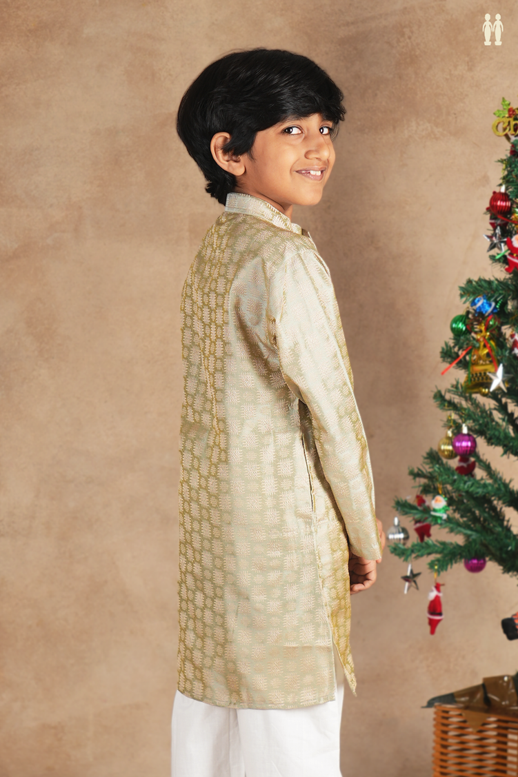 Chinese Collar Threadwork Sage Green Semi Banaras Long Kurta