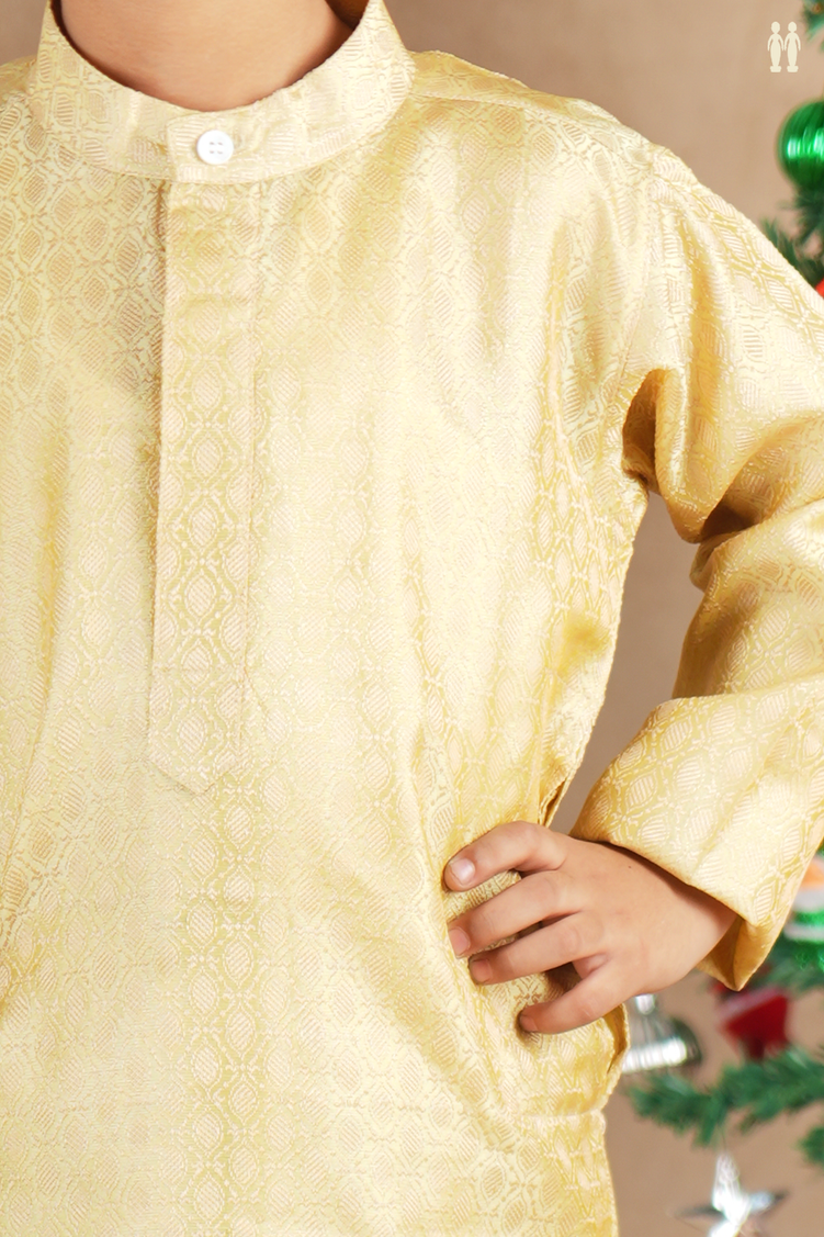 Chinese Collar Threadwork Yellow Semi Banaras Long Kurta