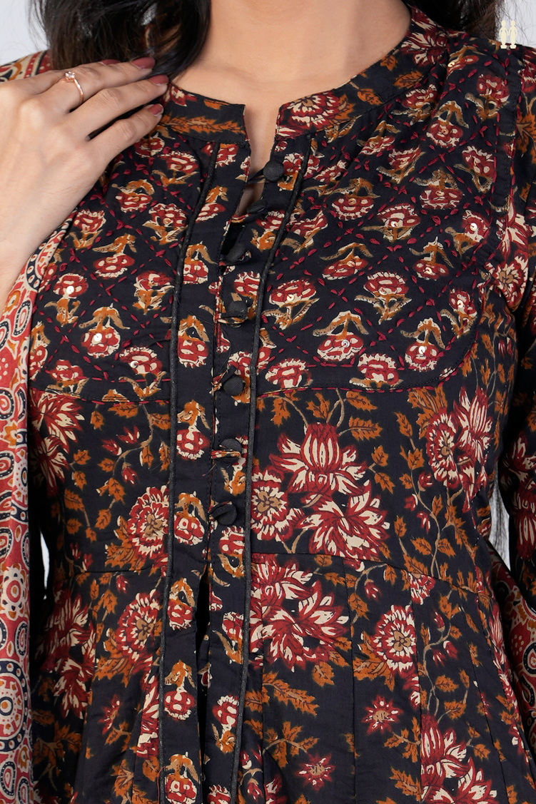 Chinese Neck Floral Design Black Printed Cotton Long Kurta
