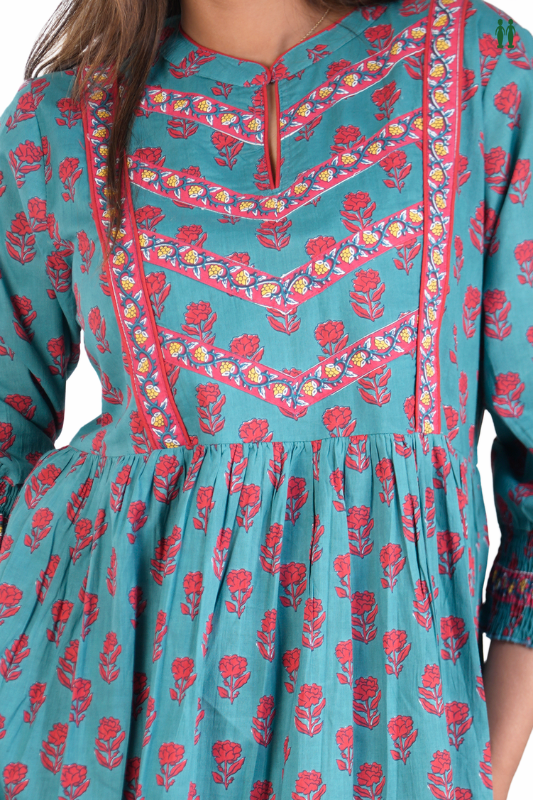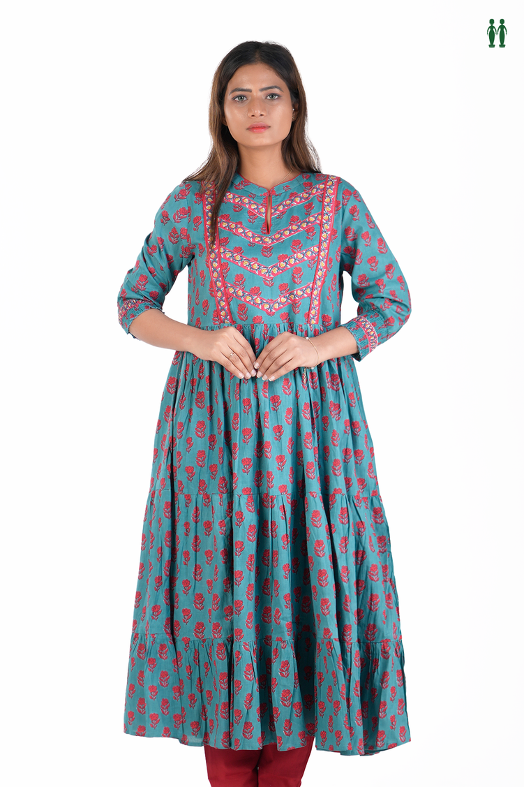 Chinese Neck Floral Printed Blue Cotton Long Kurta