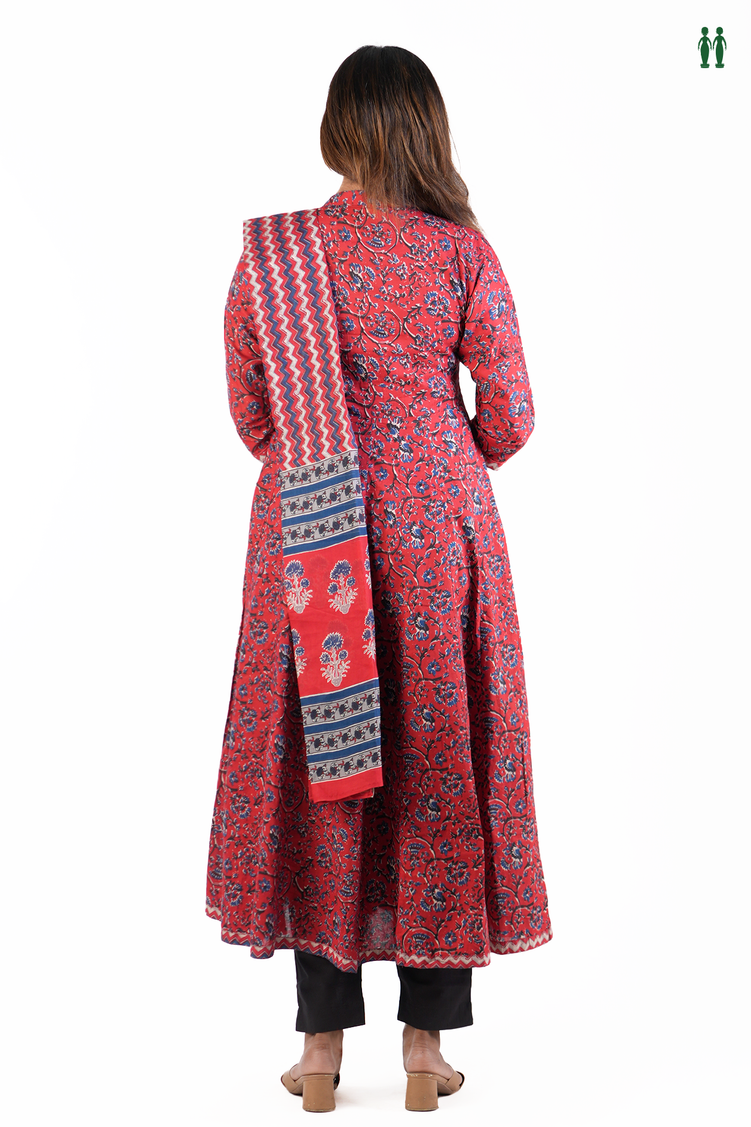 This elegant red cotton long kurta features a refined Chinese neck and delicate floral prints, offering a blend of traditional charm and contemporary style. Crafted from breathable cotton, it ensures comfort while making a graceful statement, perfect for both casual gatherings and festive occasions.