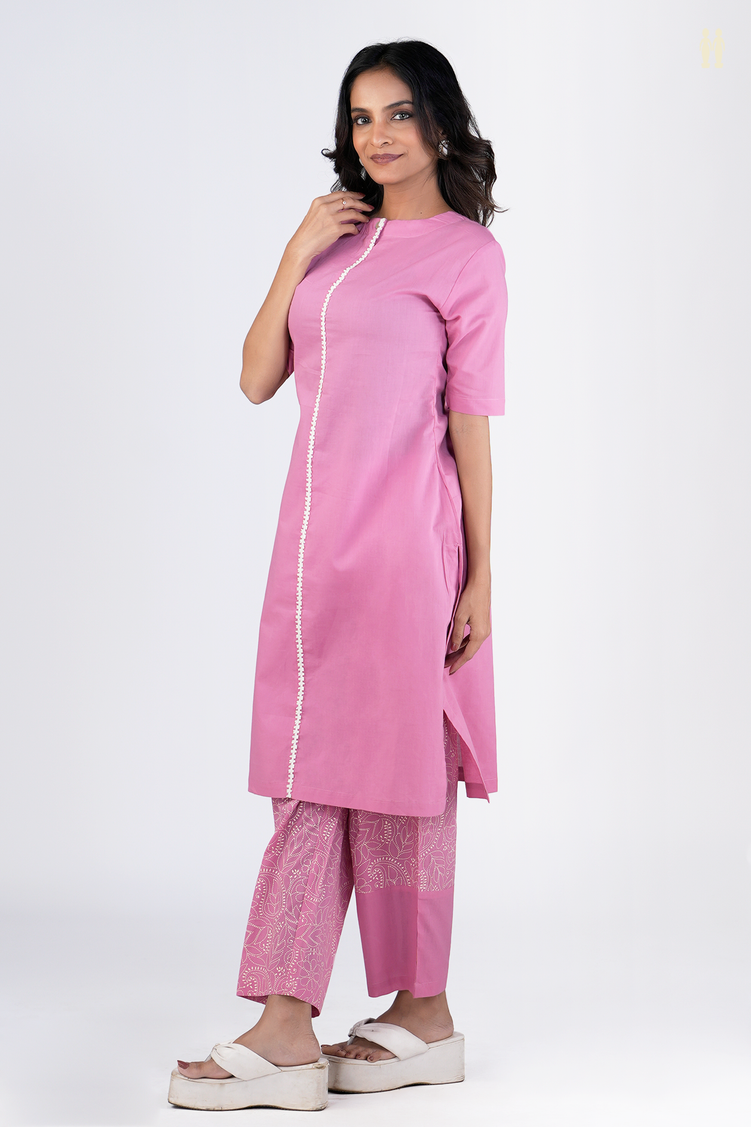 Elevate your ethnic wardrobe with this chinese neck plain pink cotton salwar set. Crafted from breathable cotton, it ensures all-day comfort while offering a graceful silhouette. The understated pink shade and elegant neck design combine simplicity with refinement, making it perfect for both casual outings and festive occasions.