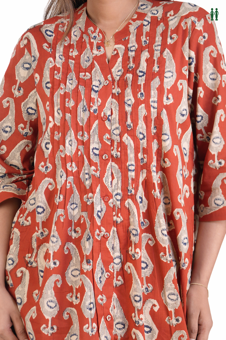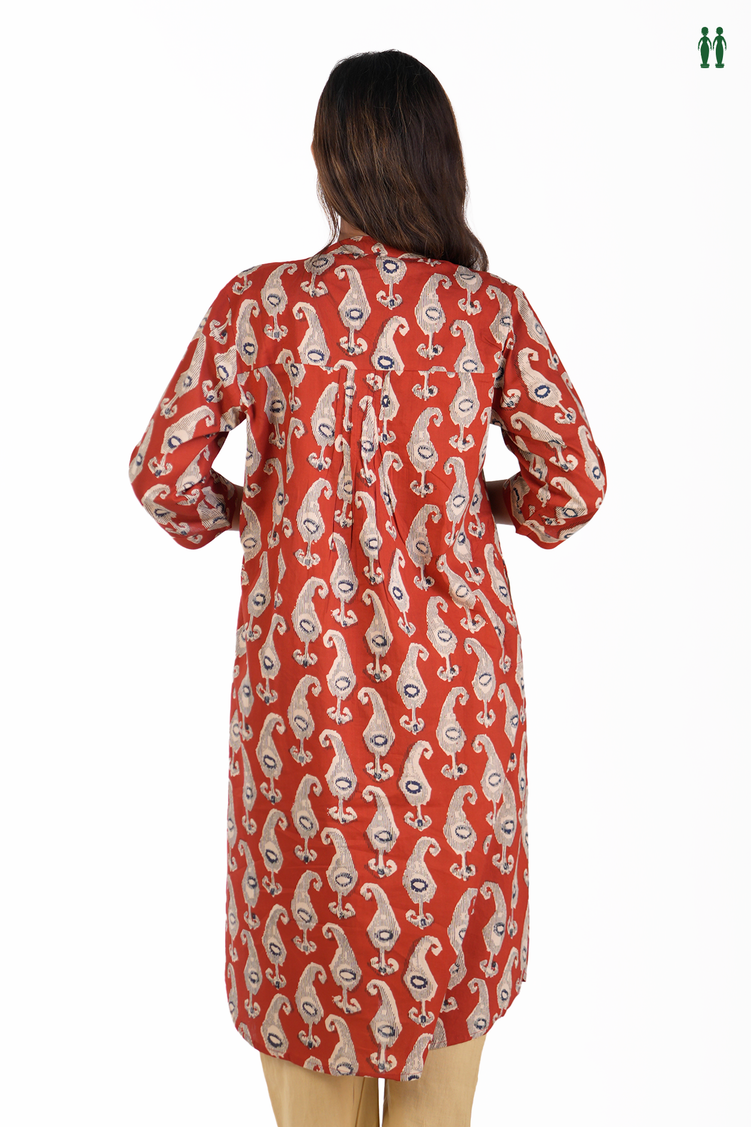 Chinese Neck Printed Design Red Cotton Long Kurta