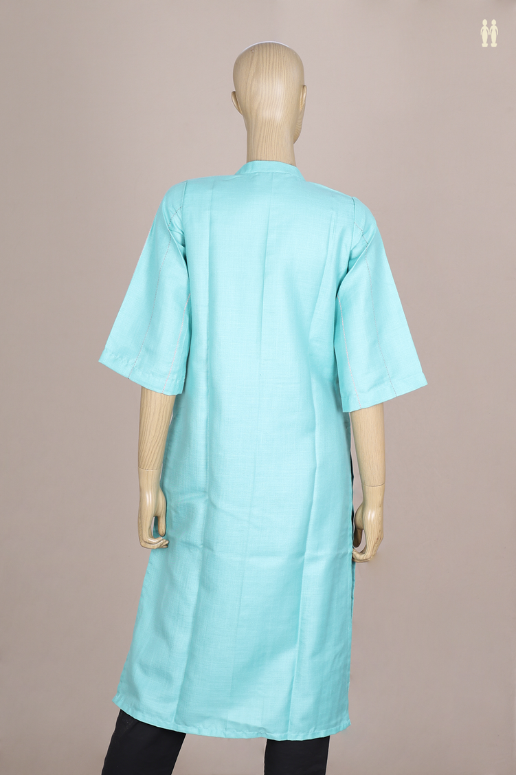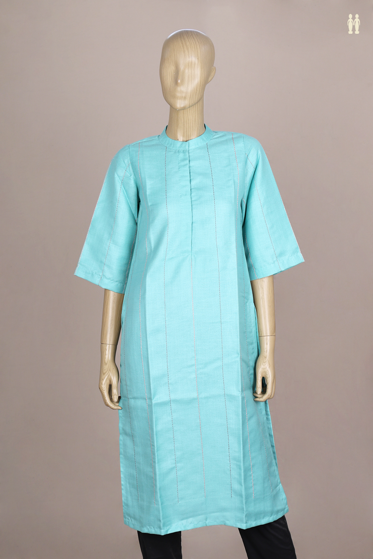 Chinese Neck Stripes Design Turkish Blue Linen Long Kurta