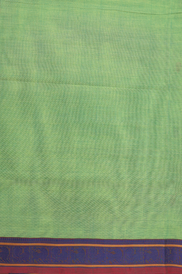 This elegant green cotton saree from coimbatore showcases intricate threadwork buttas, adding subtle texture and charm. Crafted from breathable, soft cotton, it ensures comfort throughout the day while maintaining a refined look. Perfect for formal occasions or casual gatherings, this saree combines traditional artistry with understated sophistication.