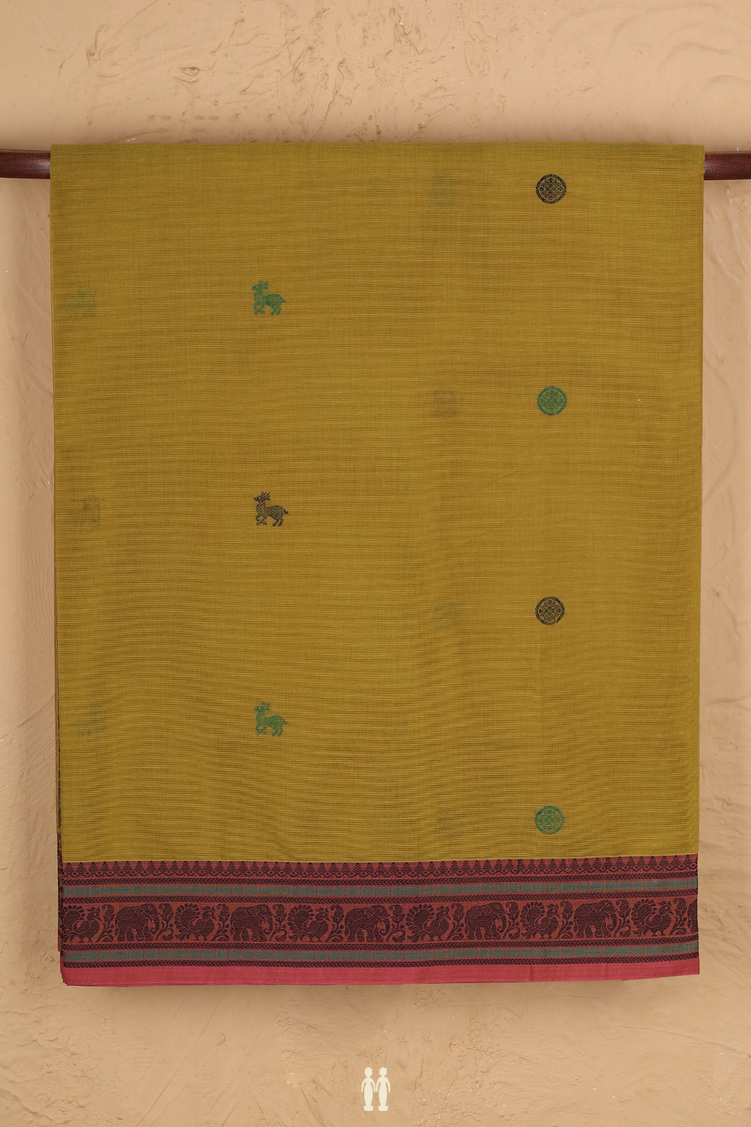 Coimbatore Cotton Saree In Olive Yellow With Threadwork Buttas