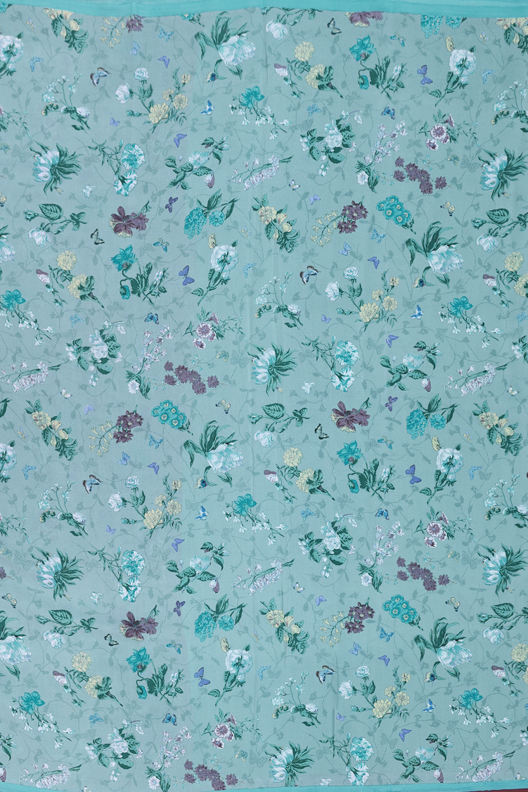 Crepe Saree In Turkish Blue With Floral Printed Design