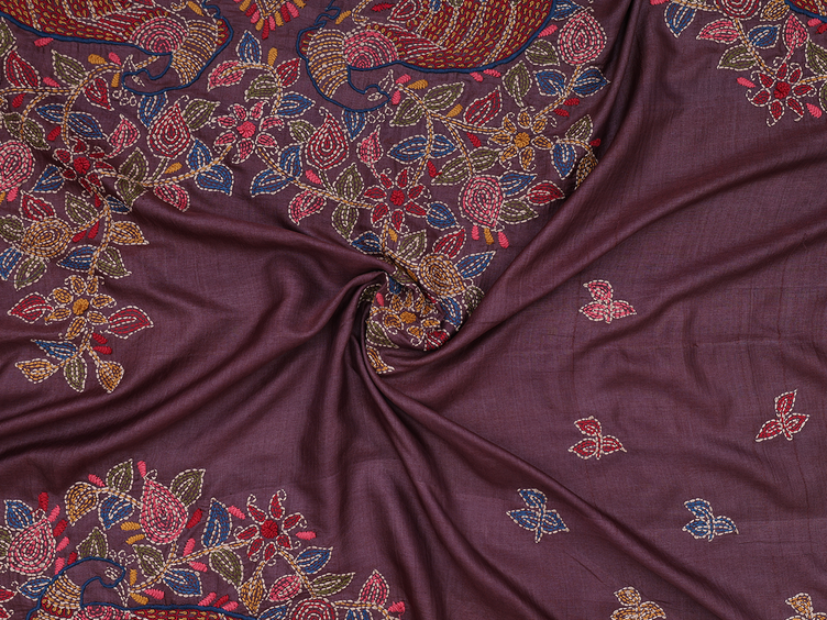 Elevate your blouse collection with this exquisite tussar silk material in rich plum brown. The fabric showcases intricate embroidered detailing that adds refined elegance to any traditional or contemporary ensemble. Tussar silk's natural texture and subtle sheen create a luxurious drape, while the sophisticated color palette complements various skin tones beautifully.Â