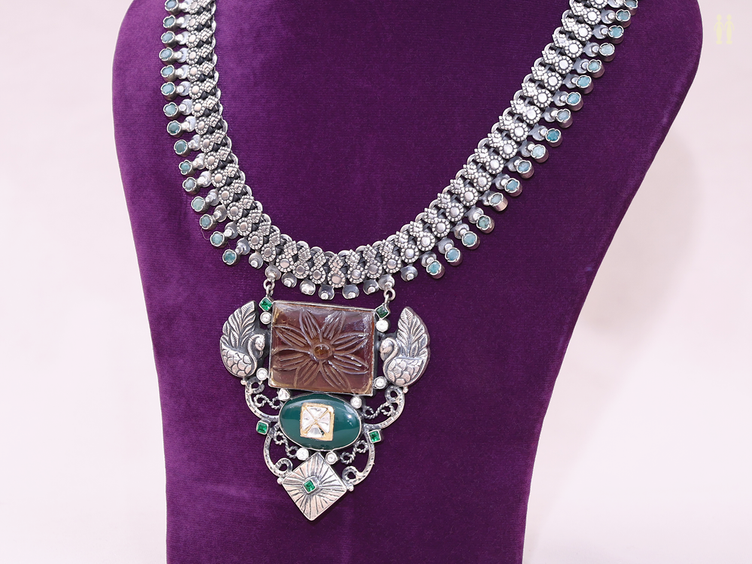 Emerald Stone With Oxidized Pure Silver Necklace