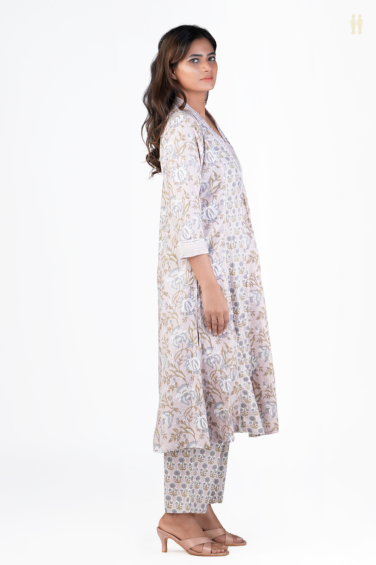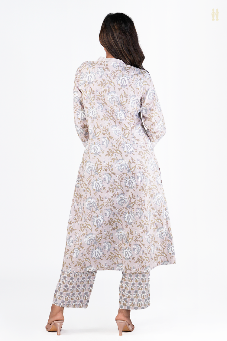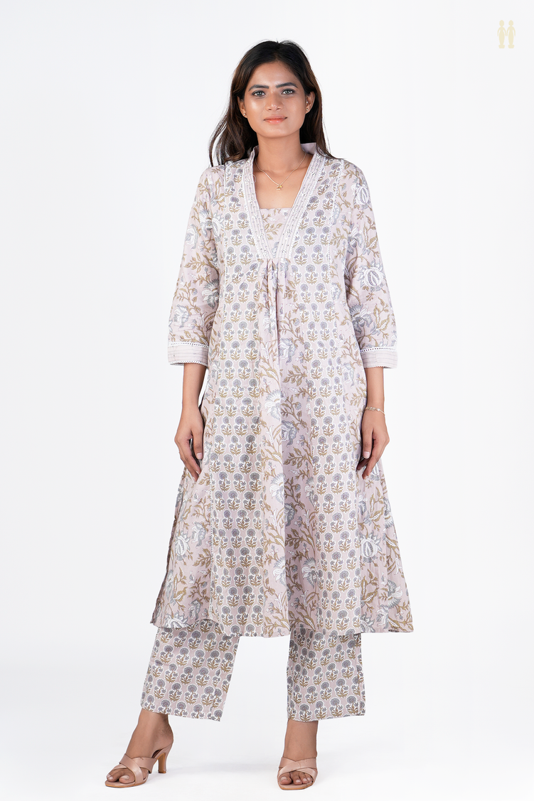 Crafted from breathable cotton, this dusty purple salwar set features an elegant floral design that embodies understated charm. Its soft fabric ensures comfort throughout the day, while the sophisticated hue adds a refined touch to your wardrobe. Ideal for casual gatherings or festive occasions, this set combines traditional style with contemporary ease.